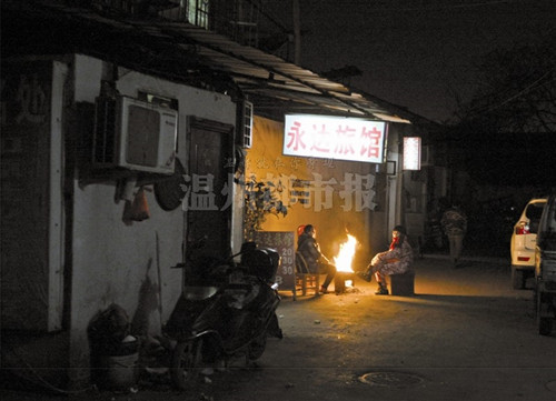 25日晚9时许,市区东屿路,室外已是-1℃。寒风把这条街上的不少“店招”吹倒了。一间小旅馆里,几名外来务工人员倚坐在炭火炉旁。见有人路过,旅馆的老板便出门招揽生意,介绍8元至35元不同档次的房间。