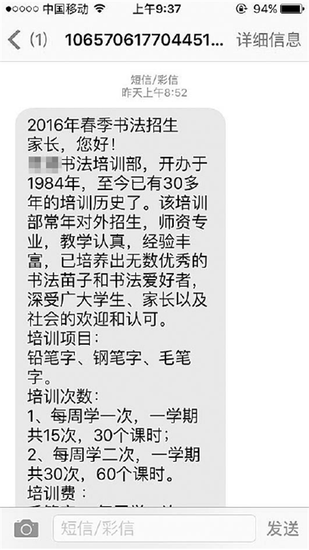 记者在该家长的手机里看到了这条“广告”。该广告分为三条短信发出,介绍了一家书法培训班的情况,广告内容非常详尽,介绍了培训项目是钢笔字、铅笔字和毛笔字,还介绍了培训次数、培训时间、培训地点,清楚注明了培训收费标准:其中毛笔字培训收费有1200元/学期和2200元/学期两种,铅笔和钢笔字培训收费也有1100元/学期和2000元/学期两种。报名联系人则留了两名老师的电话。广告还细心介绍了前往培训班的公交路线。