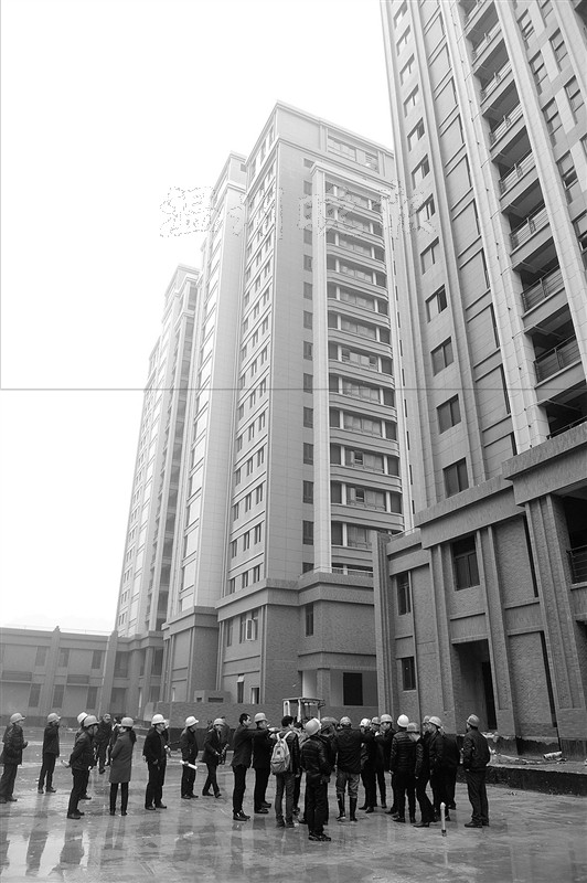 村民们带着安全帽,跟随工作人员,如同一支浩浩荡荡的寻宝队伍,来到了位于三郎桥片区东南方向的几幢大楼楼下。工作人员介绍说,这一片便是三郎桥片区的C地块,大楼的外立面粉刷与门窗安装工作都已经完成,但相应的绿化配套设施还在进行,因此楼与楼之间还是“光秃秃”的水泥地板。“这个间隔很大,跟个大操场一样,不错不错”,刚来到楼下,便有村民称赞起了楼宇之间的空间距离。