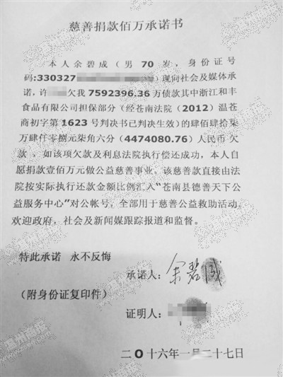 “我今年已经70岁,这笔债务共700多万元,其中连带担保的和丰公司就有400多万元,若能归还,除了还我自己的债之外,其余的已经花不了多少。”因此,在1月27日的调解会上,老余主动提出并签署了《慈善捐款佰万承诺书》。承诺书中称:“若欠款及利息法院执行偿还成功,本人自愿捐款百万元做公益慈善事业。款项直接由法院按照实际执行还款金额汇入苍南县德善天下公益服务中心对公账号,全部用于慈善公益救助活动。欢迎政府、社会及新闻媒体跟踪报道和监督。”