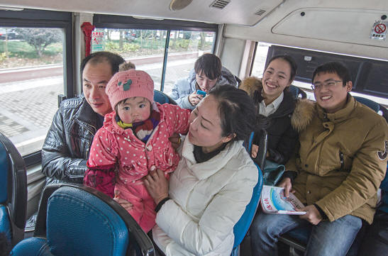 2月2日上午,洞头区居民方先生一家三代五口人搭乘151路公交车,到主城区游玩并采购年货。