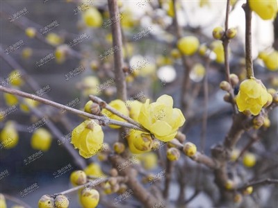 开放程度:黄色的腊梅及粉色的朱砂梅等部分花已开放,还没到完全盛开期。