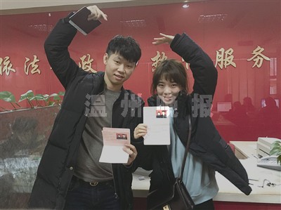 昨天,鹿城区民政局婚姻登记处的工作人员准时上岗,一对对情侣走进这里,有的忙着去婚检,有的忙着填表格。上午8点45分许,登记处最左边的窗口,工作人员给坐在对面的男女递上了属于他们的结婚证,这对正式从情侣升级为夫妻的85后,也成了昨天第一对领走“红本本”的新人。