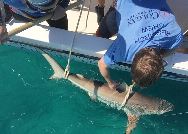 一些人员正在给迁徙而来的鲨鱼身上做标记