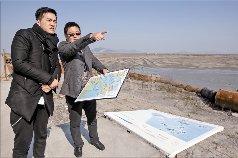 瓯江口产业集聚区一期工程东围堤上,工作人员向记者介绍二期工程的进度。