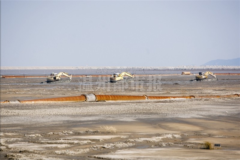 架设和迁移管线需要人工配合水上挖机。“在吹填的滩涂上架设管线难度比较大,因为水上挖机在滩涂上行进速度非常慢,每天最多只能开1公里,而我们的吹填区范围很大,最远的地方离堤有3.4公里,挖机开到那里要4天,我们迁移管线的时候往往是早上开着挖机出发,到了指定点后再徒步从滩涂上走回来。”老田说。