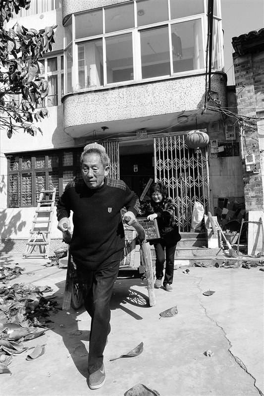 南汇街道上田行政村张宅自然村的贾师傅两口子在搬移家中剩余的几箱瓯柑,搬离住了28年的老家。