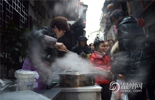 下午3点,朔门古街西街口便围满了男女老少众“吃货”,他们手中或捧着热乎乎的温州麦饼、猪油糕,或品尝着美味的糖葫芦,或把玩着晶莹剔透的糖塑。朔门西街口一字排开了温州的各色小吃:馄饨、锅贴、铜壶水果羹、瘦肉丸、敲糖让过往行人流连忘返。