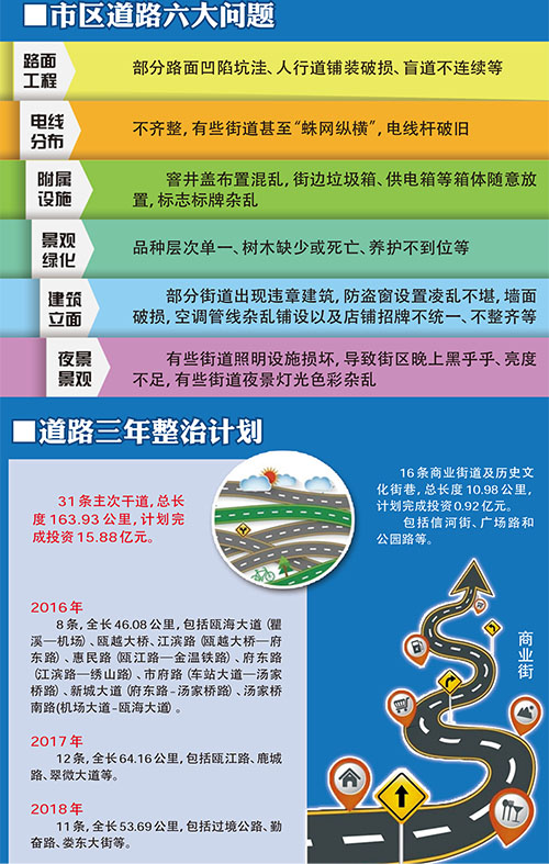 温州网讯昨天上午,温州召开市区道路建设和综合整治三年行动计划汇报会。会上,市住建委梳理了市区道路存在的六大类问题,并制订了为期三年的整治计划。