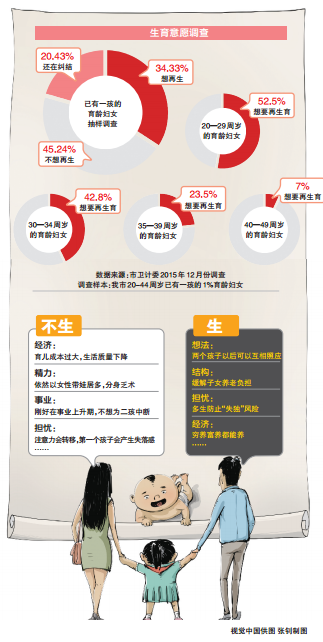 2015年12月初,市卫计委对我市20-44周岁已有一孩的育龄妇女进行过1%的生育意愿抽样调查,结果显示:选择再生育的34.33%,不再生育的45.24%,还在纠结的为20.43%。在愿意再生育的妇女中,20-29周岁育龄妇女的再生育意愿最高为52.5%;30-34周岁育龄妇女再生育意愿42.8%,35-39周岁育龄妇女再生育意愿23.5%;40-44周岁育龄妇女再生育意愿仅7%。