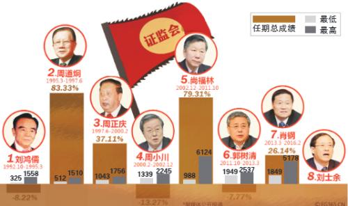 每当股价下跌时,网上就会传一次“换帅”消息,上周六已被传了一年的原证监会主席肖钢卸任消息被证实,中国农业银行前董事长刘士余接任,成为证监会成立以来的第八任主席。