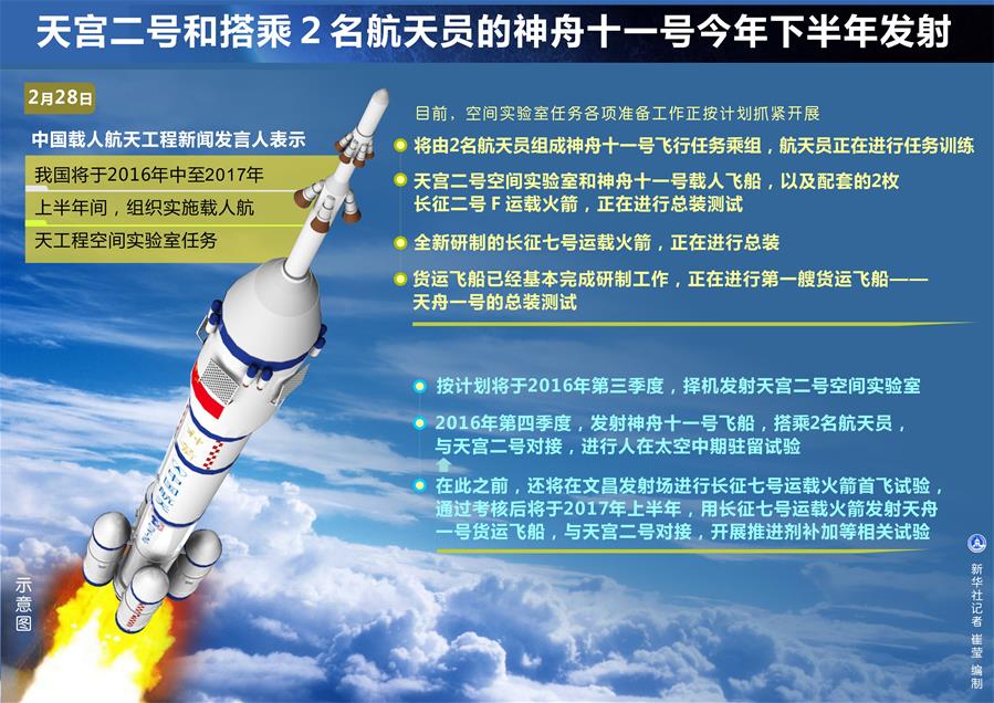 图表:天宫二号和搭乘2名航天员的神舟十一号今年下半年发射新华社记者崔莹编制