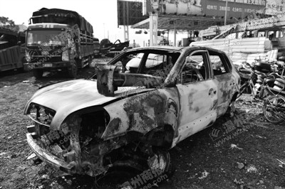 昨天下午,本报记者在停车场看到,涉事的台州牌照小型汽车为江淮越野车,该车车头严重受损,左前轮脱落,车内气囊弹出。该车旁边,停着一辆已被烧成空壳的越野车,大灯、前栅板全部化为灰烬,轮毂都烧变形了。据了解,该车即为温州牌照现代越野车,在该车的引擎盖上,摆放着一个疑似高速公路护栏的部件。