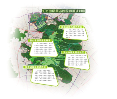 规划按统一标准,将生态园划分成13个风景特色单元,划定景源培育分级保护界线。对茶山、瑶溪、仙岩、天柱四个风景名胜区界线提出调整和优化建议。此外,规划还建议各风景区整合,统一成一个风景名胜区,或扩大现有的四个风景区范围至生态园界线,远期统一包装并申报成一个省级或国家级风景名胜区。
