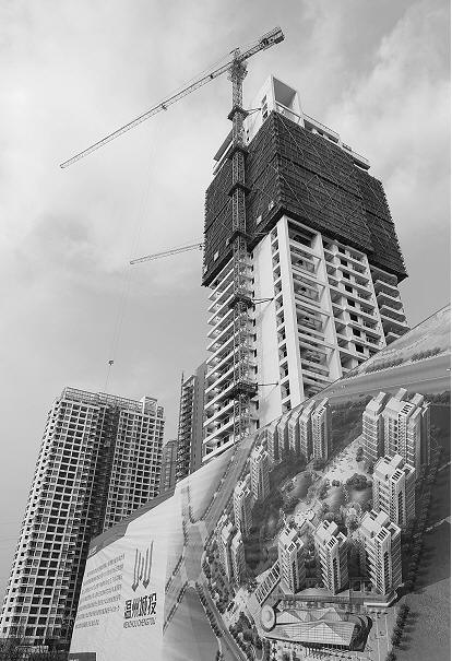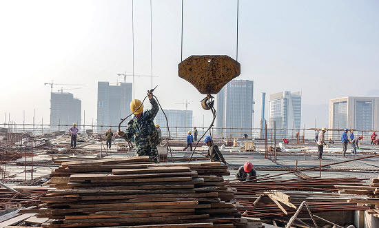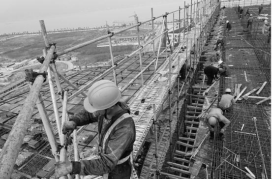 热火朝天的建筑工地,工人们身后是林立的高楼。