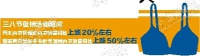 三八节是一年中内衣促销力度最大的时候,不少女性会抓住这个时机到商场选购内衣。据银泰百货三楼相关负责人林助理表示,3月1—8日,内衣区卖掉了5000多件内衣,业绩达130多万元。“这几天的业绩,可以达到内衣区全年业绩的五分之一左右。”开太百货内衣区负责人李经理也表示,因活动关系,内衣销量确实上涨明显。3月1—8日,开太百货和时代百货共卖掉5600件内衣。