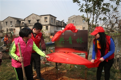 图为蒲州街道团工委树立“共青林”牌 露霞摄