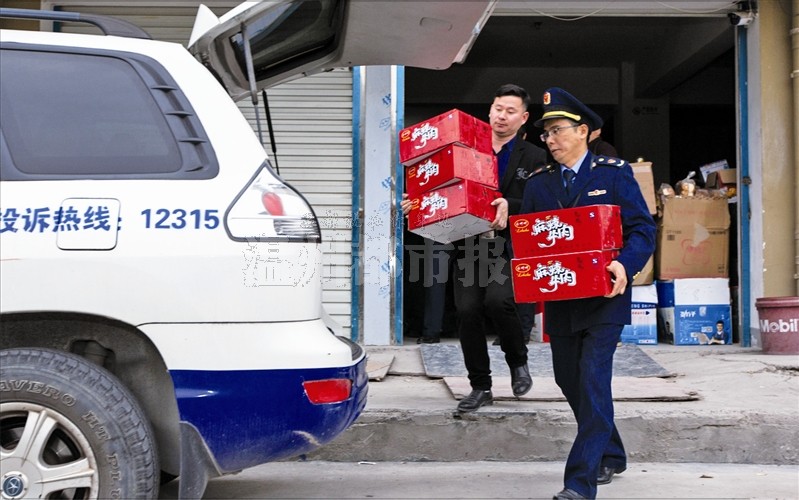 执法人员对一供货商位于市区南霞锦园的仓库进行检查,并依法暂扣封存“乐呵呵麻辣牛肉”。钱鹏鹤/摄