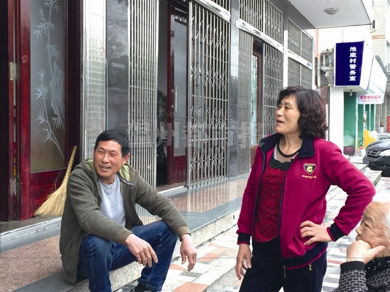 昨天,池底村村民郑加四坐在家门口,讨论外迁的事。朱斌/摄
