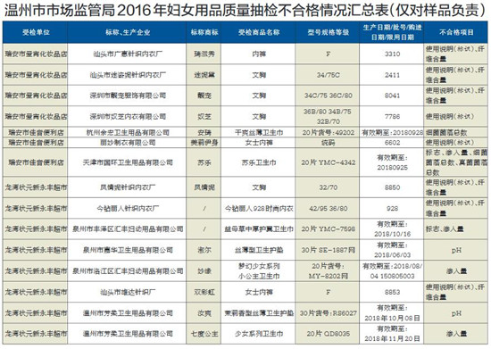 此次抽检地区为苍南、瑞安和龙湾等县(市、区),共抽样检查4家单位的40批次妇女用品,包括女士内衣和卫生巾。女士内衣的不合格项目主要集中在使用说明(标识)和纤维含量两方面,消费者在选择内衣时请注意查看产品的吊牌和洗水唛是否规范。卫生巾(护垫)产品的不合格项目主要是标志、PH值、渗入量、细菌菌落总数、真菌菌落总数。