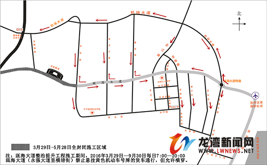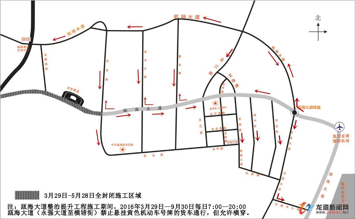 在3月29日—5月28日期间,从龙湾机场、温州经济开发区驶出前往市向的车辆,尽量不上瓯海大道高架,同时提前从瓯海大道转盘往北从机场大道前往市区;如已行至瓯海大道高架,可提前在龙江路口、曹龙路口改走辅道,以避免瓯海大道龙永路出口(机场往市区方向)囤积大量车辆而引发交通拥堵的局面。