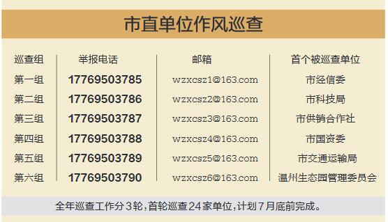 温州网讯今年首轮市直单位作风巡查已经开始行动。截至昨天,6个市直单位作风巡查组全部进驻到点,计划在7月底前完成对首轮24家单位的巡查。