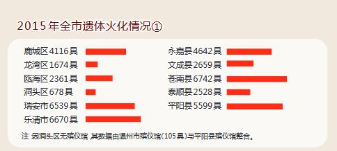 2015年我市共火化遗体数44208具,其中苍南、乐清、瑞安分别以6742具、6670具、6539具位居前三。