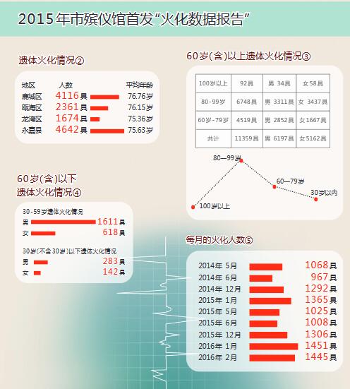 这些火化遗体中,年龄层如何分布?男女比例如何?死亡原因主要是哪些?哪些月份火化人数多……昨天,温州市殡仪馆还首次对外发布了2015年该馆遗体火化的相关数据。
