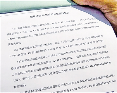 为谨慎起见,张先生请专家进行复查。今年1月,温州市城市规划设计研究院出具《现状建筑A4楼日照分析复核报告》,报告显示,张先生家里编号为C5的窗户日照时间为1小时43分,C6窗日照时间为1小时53分,均达不到“冬至日满窗日照不小于2小时”的规定。