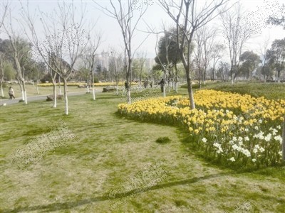 市民从杨府山公园的南大门进入,就可以看到一大片开得正热闹的黄色洋水仙花海。这种花在温州其他公园是几乎见不到的。另外,杨府山公园还有樱花、桃花、海棠、梨花等花种可以观赏。