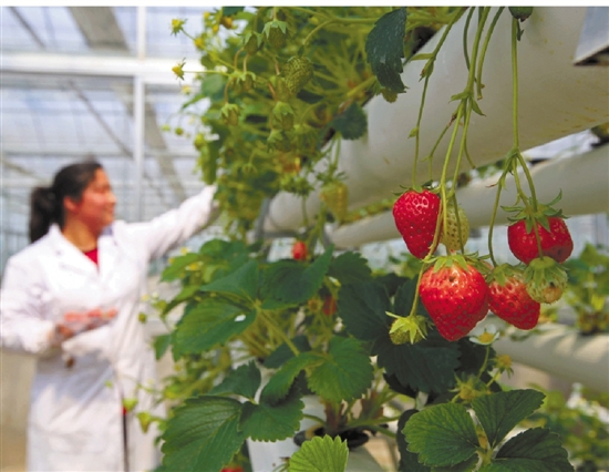 近日,龙湾雅林水培园中草莓相继成熟。该园5万多株草莓都采用立体无土基质栽培技术。无土栽培使用电解功能水,具有高效杀菌、无污染、使用操作简便等特点,是一种高效的种植新技术。王策摄