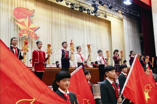 昨天下午,中国少年先锋队温州市第六次代表大会在市人民大会堂开幕,图为开幕式上举行的“星星火炬”传递仪式。温都记者郑之越/摄