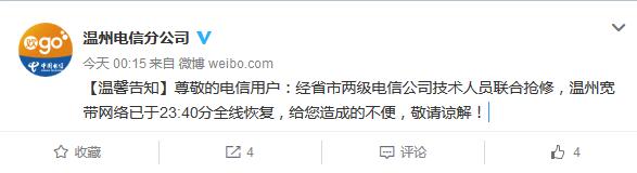 最新消息:温州电信分公司官方微博凌晨发布消息称:经省市两级电信公司技术人员联合抢修,温州宽带网络已于23:40分全线恢复。