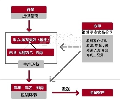 据查实,在朱A的加工点,假牛肉干生产出来后装入大箱,并不是直接发货至方甲的福州零客食品公司,而是发送给郑氏三兄弟中的郑甲开设在福建龙海市榜山镇的假牛肉包装加工点。