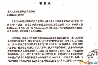 日本光荣公司给3DM游戏网发来的律师函