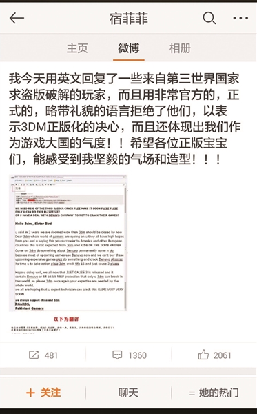 此前在收到光荣公司的律师函后,2月4日,宿菲菲在自己的个人微博上称:“内部已经开了会,从新年开始,3DM不会再破解任何单机游戏了,有国外的破解补丁转发的论坛里,也会积极处理,汉化还会坚持做。”