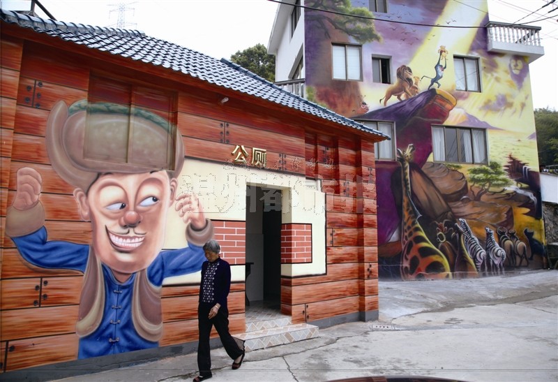 乐清石帆街道万东坑村,一座公厕外墙上的3D卡通画。