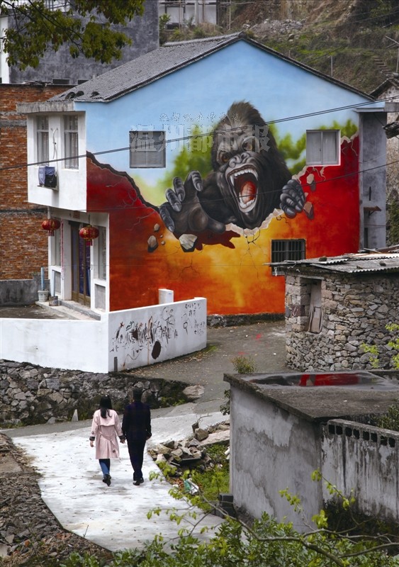 去年底,万东坑村“两委”发动村民支持3D壁画。起初,有村民不太理解,特别是一些老人不太接受,村干部就一家家上门做工作。村委会主任沈岩禄指着一幅3D大猩猩的壁画说,这幅大画有十几米高,刚开始房东不同意在自家墙上画猩猩,认为太恐怖。村干部们就做房东儿子和孙子的工作,因为小孙子喜欢猩猩,家里的老人也就不反对了。这幅壁画完成后,效果不错,不少村民由“反对派”转为“支持派”。