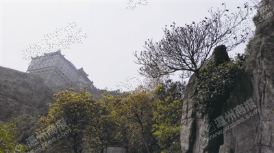 在海拔680多米的山峰之巅,是杨府侯王殿。要看清建筑全貌,没有其他制高点,只有抬头仰视。杨府侯王殿全部建在悬崖上,层层叠,共计9层,约高60米、宽25米、长40米,已成为视线所及的标志性建筑。