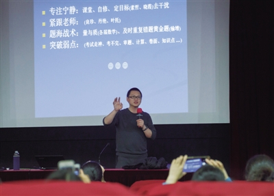 郑小侠提出,要让学生把考上理想大学作为“我自己的梦想”,而与父母、老师的期望无关。“首先就是要树立自己的目标,而且要高于现在所能达到的成绩范围,比如你已经站在三本线上,就要朝一本、重点分数冲。”郑小侠说可以把目标写在纸上、贴在桌前,时刻提醒、鼓励自己,“人生总要有几次为自己的梦想精疲力竭,当你的内心充满斗志,自然地会把紧张转化为动力。”