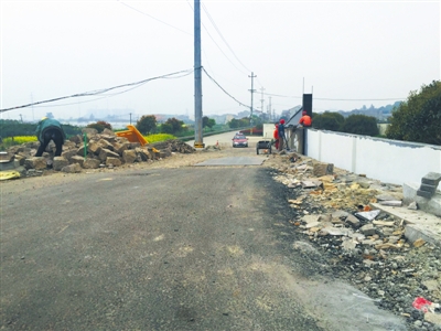 原来,通车后的曹龙路比金鸡路高了5米左右,为了方便金鸡路沿线居民通行,施工单位便用石块和沙将高出部分填平做成引桥。曹龙路快活林段实现通车是去年全区的重点攻坚项目,这两段接口路面的完善工作便被暂缓。直至今年年初曹龙路通车后,接口路面的建设才提上日程,但因金鸡路是修建已久的乡村公路,存在路面窄、弯道急、没有警示标志等安全问题,接口路面建设需要重新规划。