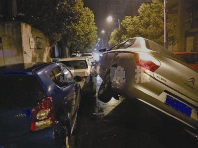 当晚10时许,一辆由西向东行驶的本田商务车,在途经该路段一十字路口准备左拐往瓯江路方向开时,不慎与由南向北直行往瓯江路方向开的雪铁龙轿车发生了碰撞,导致雪铁龙轿车左侧车轮离地,慌乱中,这辆雪铁龙轿车像耍杂技般凭两个轮子行驶了一段距离,撞上了停在左侧路边的一辆蓝色奥拓轿车后,又“踩”上一辆广本轿车才停了下来。
