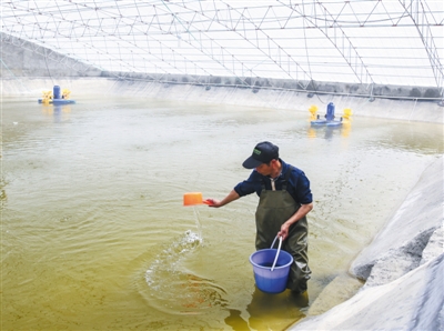 龙湾新闻网4月14日讯前天,在海滨围垦都市农业示范园区瓯南水产养殖场内,工人将近150万尾南美白对虾虾苗投放到池里。这个占地225亩的南美白对虾温室大棚养殖基地是我区传统渔业转型升级又一缩影。