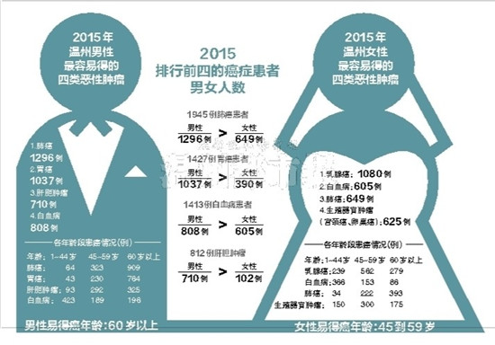 根据前两年的数据显示,温州男性最容易得的恶性肿瘤为肺癌,女性最容易得的则为乳腺癌。
