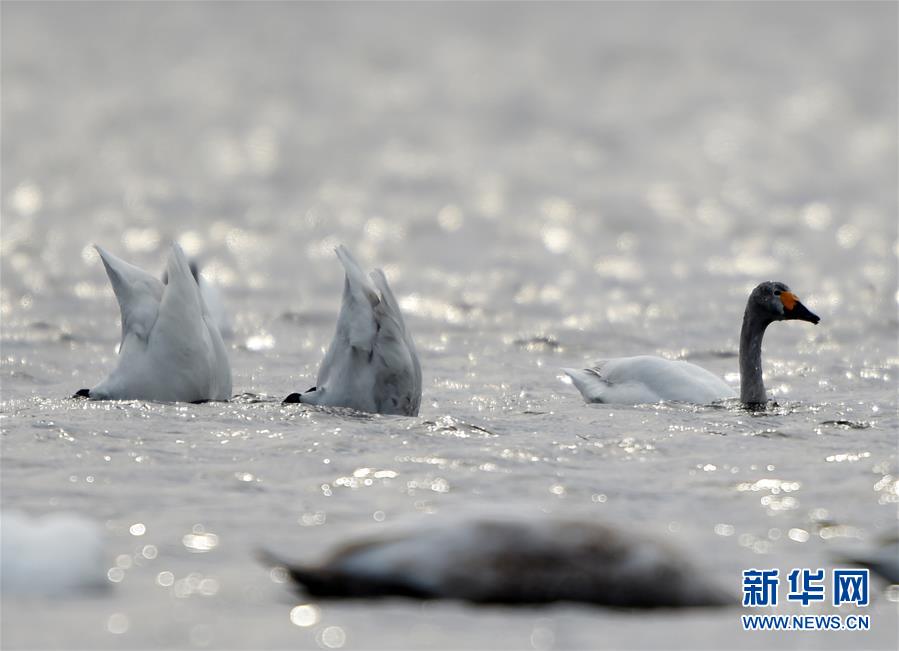 在黑龙江挠力河国家级自然保护区附近水域,两只小天鹅水中倒立觅食(4月14日摄)。新华社记者王建威摄