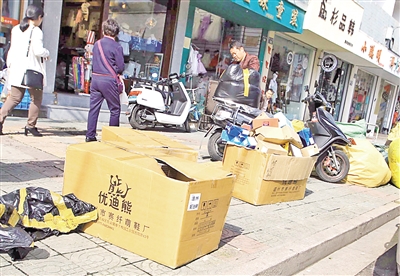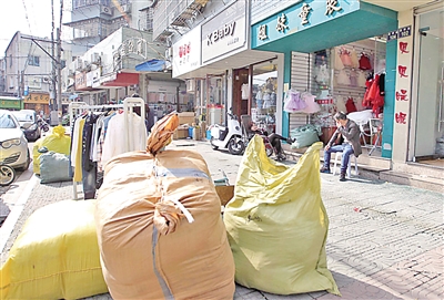 市区铁井栏、县前头、县学前,温州规模较大的童装批发零售集中地带,也是市区占道现象较为严重的区域之一。昨天上午,记者在县学前看到,整条街几乎都是童装店,每家童装店门前的人行道都被不同程度地占用。刚到的货物、未拆封的包裹、过季打折的衣服,摆摊用的桌椅,这些统统搬到人行道路面上来。特别是华盖公寓前的人行道,几乎被商家们侵占了大半,因此引来行人抱怨:“挺宽的人行道,被占了一半都不止。如果商家货物多,有时候还会把整条人行道都占去。”