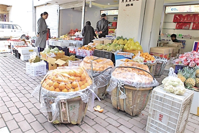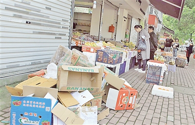 除了童装店将店铺向人行道“扩张”外,附近兴文里农贸市场外一家新开的水果店也堂而皇之将人行道“圈入”营业范围之内。芒果、菠萝、草莓这些当季水果一筐筐搬出店铺,摊开在人行道上叫卖,店主还做了向外延伸的遮阳篷,宽度足有二三米,似乎做好长期占道的准备。