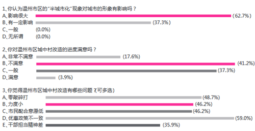 调查问卷结果显示,所有参与调查的市民均认为市区的“半城市化”现象会对温州城市的形象带来影响,其中62.7%的市民认为影响会很大。