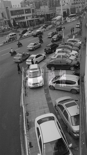 新城宏源路,是新城大道连接学院东路的干道之一,高峰期因为乱停车会经常拥堵。记者看到不少车子随意停到路中间,尤其是一到就餐时间,天天中餐厅外面的路面上,停了两排的车子,个别车辆甚至逆向停到路中间,占用了原本就不宽的机动车道。在宏源路和清源路交叉路口,乱停车现象更是突出,斑马线已经被车辆占领,连斑马线边上的人行道也塞了车,行人只得挤着绕行。