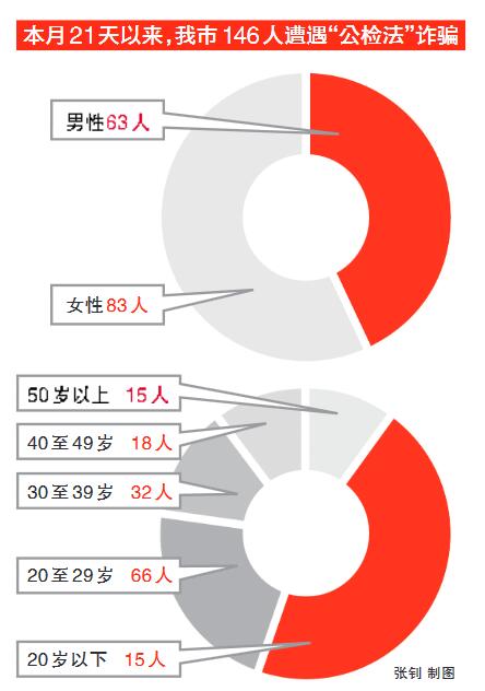 据防诈骗中心统计,4月1日至21日,我市落入“公检法”通讯诈骗有146人(其中男性63人,女性83人),损失540万。在回访调查中,民警发现20岁以下的有15人,20至29岁有66人,30至39岁有32人,40至49岁有18人,50岁以上15人。